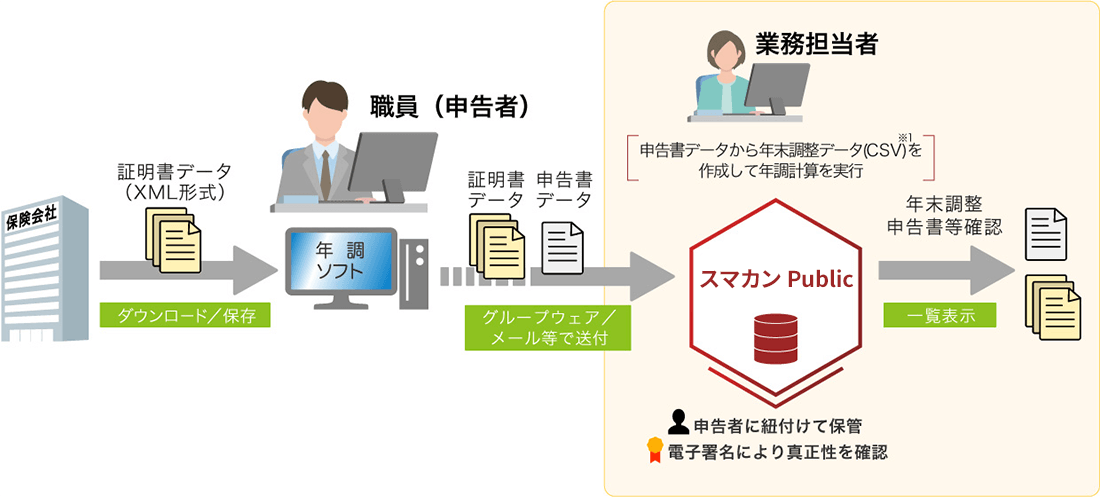 保険会社等から取得した[証明書・申告書]データを「年調ソフト」にインポートして作成した年末調整申告書の電子データに申告者の情報を紐づけ、また同時にで電子署名による真正性(改ざんが無いこと)の証明を加えて『スマカン Public』に保管します。